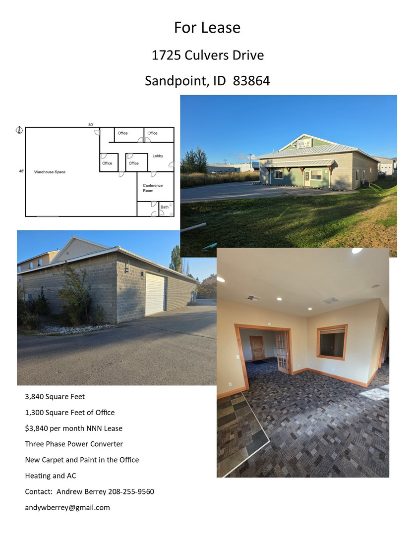 1725 Culvers Drive, Sandpoint ID 83864 Building for Lease 3,840 square feet with 1,300 square feet of office. $1.00 per square foot NNN lease per month. Three Phase Power Converter Call or email Andrew Berrey 208-255-9560 [email protected]