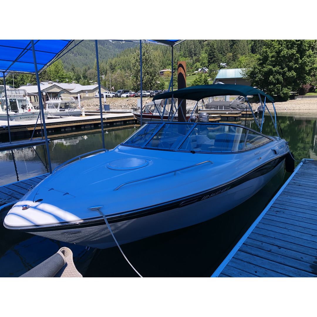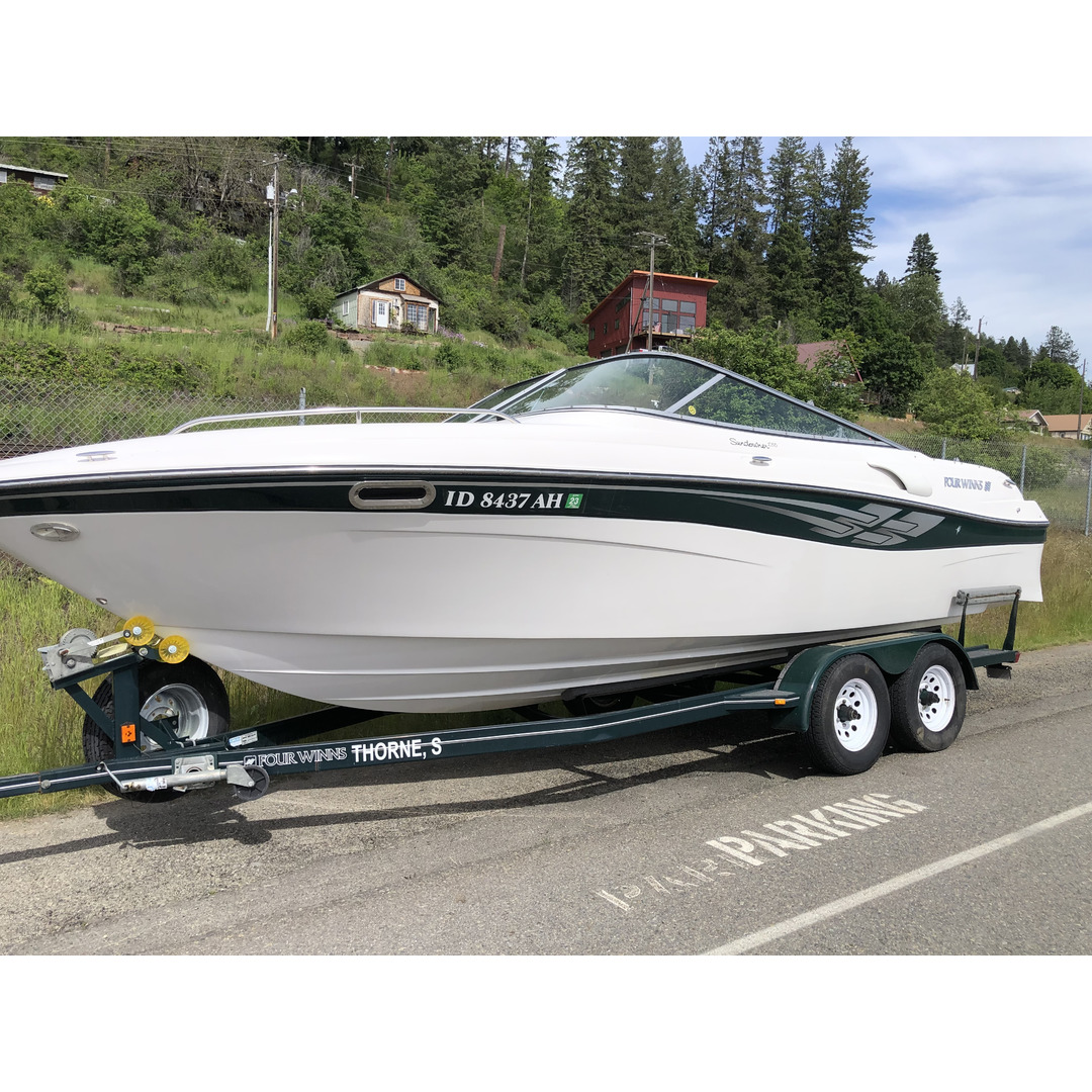 This 2001 Four Winns Sundowner is offered for 15,000 obo. It’s has covered moorage and is located in Holiday Shores Marina, Hope, ID. The moorage can be transferred for $300 and is a rare opportunity in itself. The boat was tuned up in 2023 and both batteries were replaced. Please see the photos with the sticker detailing all options on the boat. The trailer bunks were refurbished in 2023 as well. The power is a 280 hp Volvo duo prop and maintenance on the gimbal bearing and lower unit is up to date as well. All recent maintenance and storage has been with Big Lake Marine in Sagle ID. Currently the boat is in the water so it can be driven out.